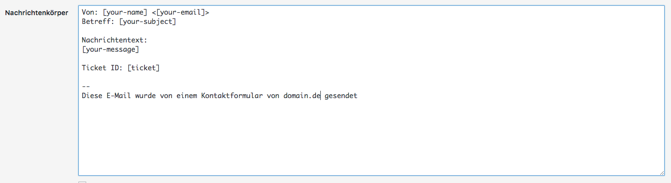 Ins Mail Tempalte muss nun noch der [ticket] Platzhalter. Achtung, die Anpassungen funktionieren nur für die Mail die Ihr selber bekommt. Sollen eure Besucher ebenfalls die Ticket ID in der Mail haben. muss die wpup_save_form erweitert bzw gekloned werden. Also den entsprechenden Part der Function durch diesen ersetzen und den Platzhalter ins Mailtemplate einbauen. Achtung !!! ungetestet da nicht benötigt.